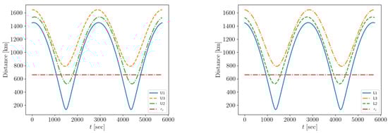 Scenario A is similar to Starlink’s Phase 1 V2 constellation []. The optimal F is equal to 13 as quoted in Table 3. To ensure connectivity across the network as discussed in Section 2.3, we first need to estimate the distances between a satellite and its adjacent neighbors. Figure 7 (left, right) show the distances of the upper- and lower-orbit adjacent satellites for satellite . For this constellation, the distance between two consecutive satellites in the same orbit is km. We observe that, in both cases, the distances between the satellite and its upper- and lower-orbit neighbors fluctuate significantly within one orbital period, ranging from km to km. These distance fluctuations exhibit a periodic behavior as the central satellite moves through the upper and lower halves of its trajectory around the Earth. Due to the uniformity of the constellation, these fluctuations are practically the same for the upper- and lower-orbit neighbors, and , respectively, differing only by an initial time displacement. The figures indicate the varying conditions for inter-orbit links: while intra-orbit link distances remain constant at , the inter-orbit link length varies from about one fifth of to more than twice that.