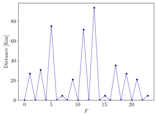 To choose the optimal value for F, we can run simulations considering various possible values of F to determine the minimum satellite-to-satellite distance over an orbital period, . We can significantly speed up the computations by leveraging the uniformity of the constellation. Thus, instead of considering all possible combinations of satellites, we can focus on one particular satellite and calculate the distances to all other satellites within one orbital period [,].