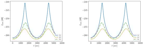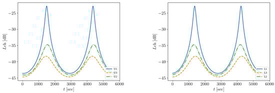 Path loss variations for links established between satellite and its adjacent neighbors in the (left) upper orbit and (right) lower orbit, observed over one orbital period.