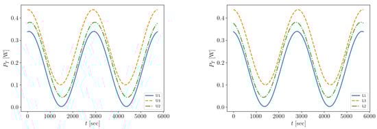 Required transmission power, , for establishing links between satellite and its adjacent neighbors in the (left) upper orbit and (right) lower orbit, observed over one orbital period.