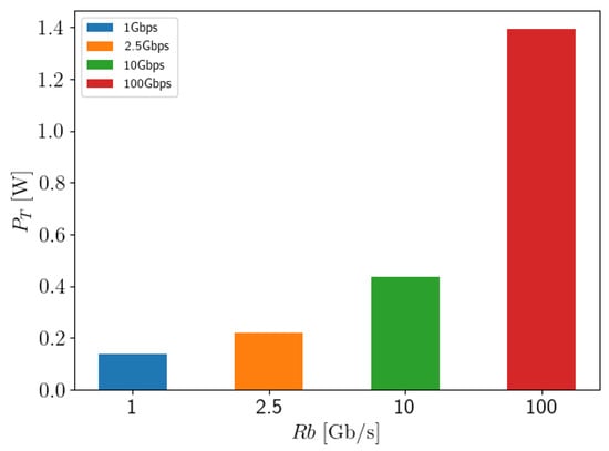 Another practical conclusion that can be drawn from these figures is the fact that, especially for neighbors in adjacent satellite orbits, the required power varies significantly over time, and hence, it may be advantageous to consider adaptive schemes to calibrate the transmission power to its required value rather than simply transmitting the maximum value obtained in the figures. Figure 12 shows how the required power scales with the specified data rate . As expected, the required optical power increases as the data rate rises. For 100 Gbps, it surpasses 1 W []. Note that even at such data rates, power requirements levels remain low enough to be achieved in miniaturized terminals using optically amplified transceivers [].