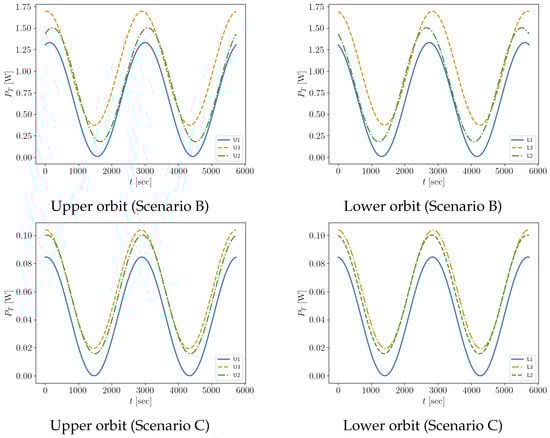 Transmission power required, , for establishing links between satellite and its adjacent neighbors over one orbital period: (left) neighbors in the upper orbit and (right) neighbors in the lower orbit, for scenarios B and C.