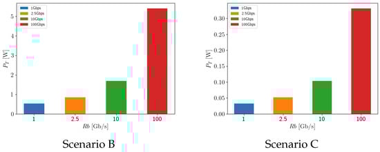 Maximum transmission power required to maintain connectivity between adjacent satellites as a function of the data rate, for Scenarios B and C, as described in Table 3.