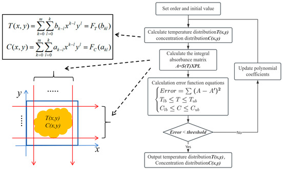 The overall algorithm is illustrated in Figure 1. It integrates multi-spectral measurements via TDLAS with physical a priori information, imposing upper and lower bounds on temperature and concentration for each grid cell. By solving the minimization of the error equations using a Sequential Quadratic Programming (SQP) algorithm, the bivariate polynomial coefficient matrices a and b in Equations (3) and (4) are determined, yielding the reconstructed temperature and concentration fields.