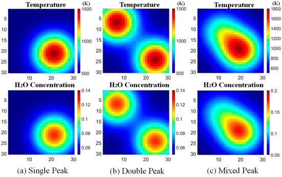Numerical simulations are conducted to verify the performance of the proposed bivariate polynomial algorithm. Three different combustion field configurations are simulated. Figure 3a represents a single Gaussian peak distribution, Figure 3b represents a dual Gaussian peak distribution, and Figure 3c represents a mixed dual Gaussian distribution. For the single-peak and double-peak cases, the temperature ranges from 500 to 1500 K with a H2O concentration between 0.05 and 0.12, while the mixed peak spans 500–1800 K with a H2O concentration from 0.05 to 0.15. The measurement domain is discretized into a 30 × 30 grid. The side length of the simulated distribution is set at 6 cm with a spacing of 0.2 cm between beams.