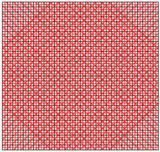 The simulation employs four projection angles (0°, 45°, 90°, and 135°) with 30 beams per angle, yielding a total of 120 laser paths as depicted in Figure 4 (red lines represent laser paths, and the black grid lines indicate the discretization). Four absorption wavelengths (1339 nm, 1343 nm, 1392 nm, and 1469 nm) are selected, and the integrated absorbance at these wavelengths is computed using absorption line parameters from the HITRAN database.