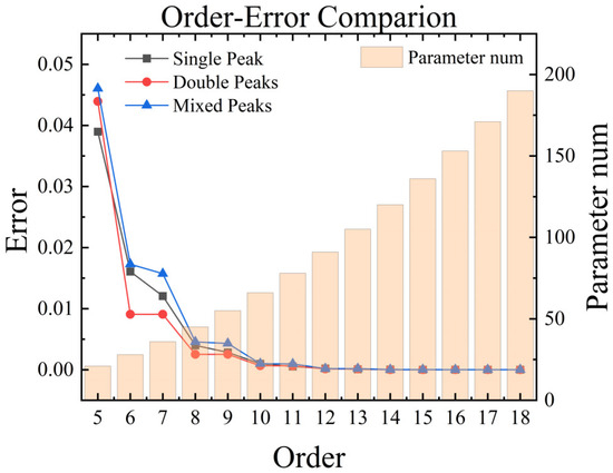 For the single-peak, dual-peak, and mixed fields, the reconstruction error between the bivariate polynomial model and the simulated temperature field is computed for various polynomial orders, with the results shown in Figure 5. The results indicate that for lower orders (below 9), the error differences among different field types are significant, potentially reducing the model’s generalization capability. When the order exceeds 12, the reconstruction errors across the three configurations become comparable, suggesting that a higher-order polynomial can universally describe diverse combustion fields. However, as shown by the increase in the number of polynomial coefficients with order, an excessively high order leads to a rapid increase in unknowns, which may cause underdetermined problems and significantly raise computational costs.