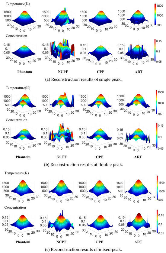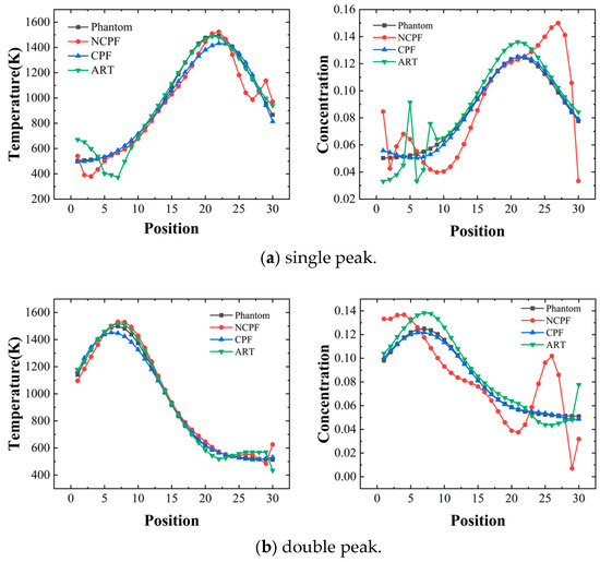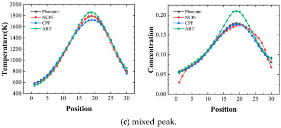 Reconstruction results of temperature and concentration distribution: (a) single peak; (b) double peak; (c) mixed peak.