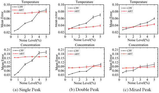 The superior performance of the CPF algorithm is further evidenced by its contrast with the NCPF method, which exhibits significant errors and distorted concentration reconstructions. To assess robustness, Gaussian white noise levels ranging from 0.5% to 5% are added to the integrated absorbance matrix of the three simulated distributions. For each noise level, 30 simulation trials are performed to mitigate random fluctuations, and both the CPF and ART algorithms are applied. The average reconstruction errors for the three configurations are shown in Figure 8, with error bars representing the standard deviation over 30 trials. Although the CPF algorithm’s error increases more rapidly with noise compared to ART, the overall error remains low. Under 5% Gaussian white noise, the temperature reconstruction errors for the three configurations are 8.48%, 7.02%, and 6.01%. Notably, ART exhibits smaller variations with noise, indicating higher stability, while the CPF algorithm’s stability requires further improvement.