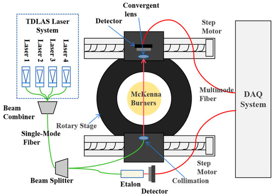 Using this principle, TDLAS technology can retrieve spectral information for specific absorption lines, which in turn can be used to infer gas temperature and concentration [18,19]. By combining data from multiple angles and laser paths with CT reconstruction algorithms, a two-dimensional map of flow field parameters is obtained [20,21].