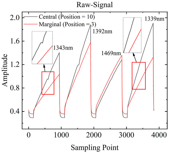 Figure 13 presents the raw measurement signals, with the black line representing the central region and the red line the periphery. It can be observed that the absorption in the peripheral region is significantly weaker compared to the center. Notably, the absorption peaks for the 1343 nm and 1339 nm lines are almost indiscernible, and those for the 1392 nm and 1469 nm lines are markedly diminished. As indicated by the one-dimensional comparisons in Figure 7, although the algorithm describes the low-temperature region reasonably well, its performance degrades under high noise conditions. This suggests that the pronounced deviations in the low-temperature region are due to a reduced effective optical path and lower signal-to-noise ratio (SNR) as the temperature decreases toward the burner edge, resulting in diminished measurement sensitivity.