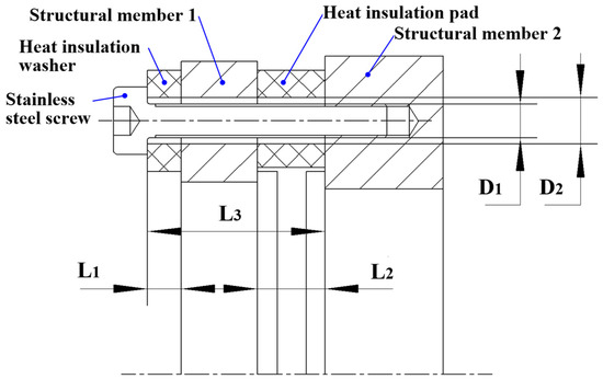 where Rc1, Rc2, Rc3, Rc4, and Rc5 are the contact thermal resistances between different structural elements; λ1 and λ2 are the thermal conductivity of the polymer material and stainless steel, respectively; L1 and L2 are the thickness of the insulation washer and insulation pad, respectively; L3 is the length of the connecting section of the stainless steel screw; A1 and A2 are the area of the insulation pad protrusion and the bottom of the insulation washer, respectively; and D1 and D2 are the diameter of the stainless steel screw and the through-hole, respectively.