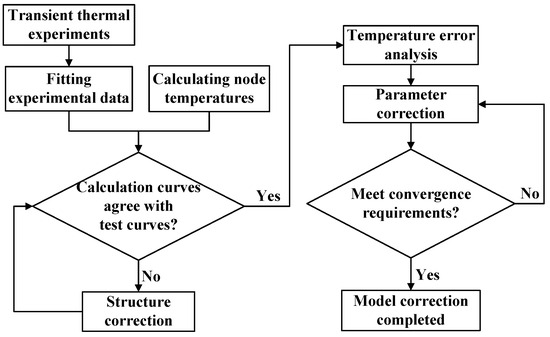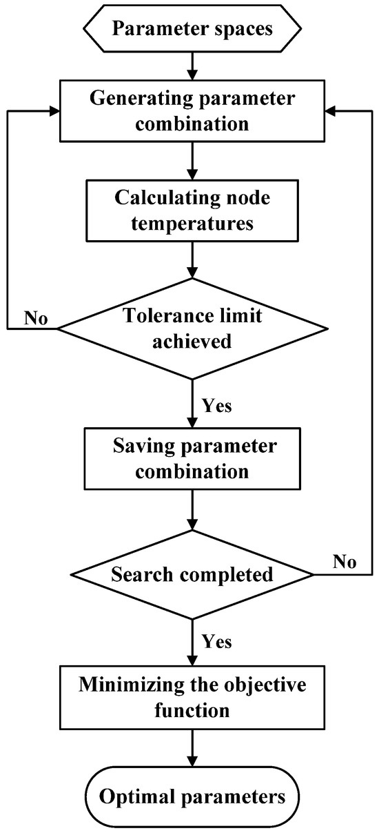 In accordance with the findings of our preceding study [28], seven distinct categories of thermal parameters were derived from the thermal resistances. Through a thermally sensitive analysis, 11 key parameters and the optimal range of values were identified. Table 2 illustrates the pivotal thermal parameters, together with their initial values and optimal ranges. Consequently, the correction process is exclusively applied to the values of the pivotal thermal parameters, while the initial values of the less sensitive parameters remain unaltered.
