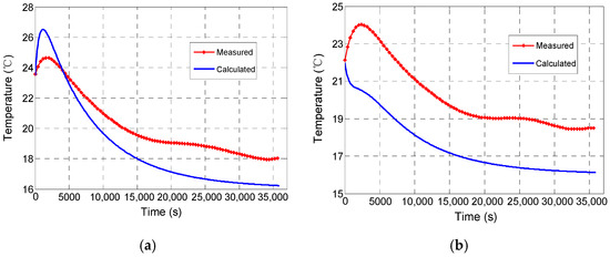 Calculated and measured temperatures before correction of thermal network structure: (a) window; (b) window barrel.
