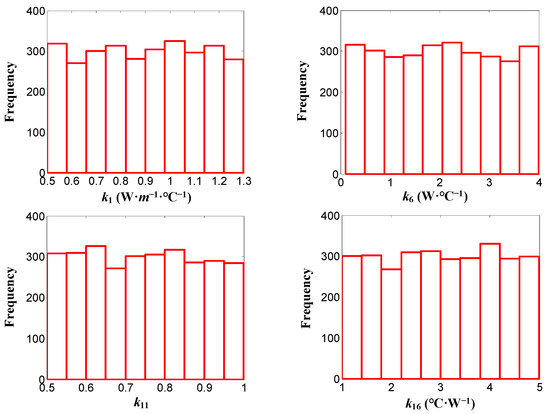 - A set of parameter values is randomly selected from the parameter spaces and input into the thermal balance equations, as shown in Equation (1), by calculating the transient temperature variations of the nodes.