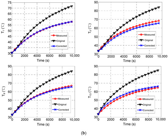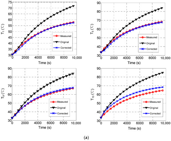 - The calculated temperature curves and the measured ones are sampled at the same time interval. The calculated and measured temperature values at the sampling point are then compared on an individual basis, and the tolerance limit condition is given bywhere Ti(u)(τr) and Tis(u)(τr) are the calculated and measured temperature of node i at sampling time point τr under the u-th heating condition, respectively, and Tlim is set as 5 °C in this case.