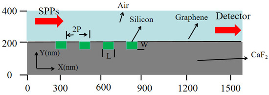 The simulation model we designed is shown in Figure 2. We used a two-dimensional model for simulation as the structure is symmetrical, which simplifies the computational workload. The SPPs are excited using port mode. The carrier density of the graphene is periodically doped due to the contact between the silicon and graphene, resulting in a periodic spatial distribution of the carrier density in the graphene. The overall carrier density in the graphene is modulated when a voltage is applied, resulting in different Fermi levels of the graphene. The influence of different lengths, widths, and periods of silicon grating at different Fermi levels and wavelengths was analyzed. The electric field distribution and optical transmission were utilized to observe the modulation performance. The P, L, and W represent the period, length, and width of the silicon grating, respectively.