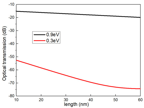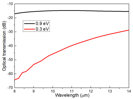 The distribution of carrier density has various scattering effects at different wavelengths. The relationship between the optical transmission and the wavelength of the SPPs at 0.3 eV and 0.9 eV, respectively, is shown in Figure 10, with the optical transmission reaching its maximum value of 47.2 dB at a wavelength of 8 μm.