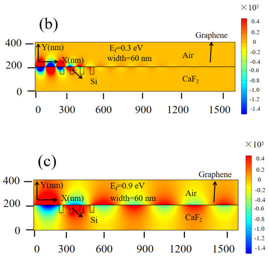 The equivalent refractive index of silicon grating and graphene changes when the width of grating is different, resulting in a different scattering effect on the propagating SPPs. Figure 5a shows the y component of the electric field with a grating width of 10 nm and a Fermi level of 0.3 eV. Figure 5b shows the y component of the electric field with a grating width of 60 nm and a Fermi level of 0.3 eV (the length, grating period, and wavelength of the SPPs are fixed at 30 nm, 60 nm, and 8 μm, respectively). It can be clearly observed that different grating widths have a significant impact on the propagating SPPs by comparing Figure 5a,b. At the same time, the overall carrier density can be modulated by the applied voltage. Figure 5c shows the y component of the electric field with a grating width of 60 nm when the Fermi level of the graphene is set to 0.9 eV. It can be demonstrated that under the same width, the propagating SPPs can be further dynamically controlled via applying voltage by comparing Figure 5b,c, providing an additional dimension for modulating the SPPs and improving performance.