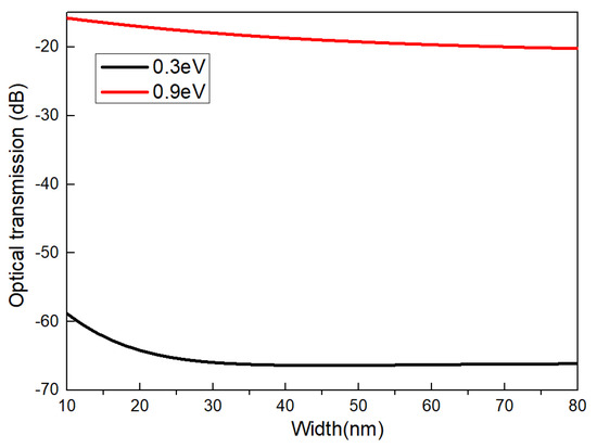 The grating width can affect the equivalent refractive index of the silicon grating and the graphene, resulting in a different scattering effect. The relationship between the optical transmission and different grating widths at 0.3 eV and 0.9 eV is depicted in Figure 6, with the optical transmission reaching its maximum value of 47.9 dB when the silicon grating width is 28 nm.