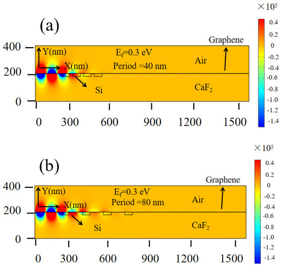 Different grating periods have various scattering effects on the propagating SPPs. Therefore, we investigated the change of the y component of the electric field at different periods. Figure 7a shows the y component of the electric field with a grating period of 40 nm and a Fermi level of 0.3 eV. Figure 7b shows the y component of the electric field with a grating period of 80 nm and a Fermi level of 0.3 eV (the length, width of the grating, and wavelength of the SPPs are fixed at 60 nm, 30 nm, and 8 μm, respectively). It can be clearly observed that different grating periods have a significant impact on the propagating SPPs by comparing Figure 7a,b, owing to the various distribution periods of carrier density. At the same time, the overall carrier density can be modulated by the applied voltage. Figure 7c shows the y component of the electric field with a grating period of 80 nm when the Fermi level of the graphene is set to 0.9 eV. By comparing Figure 7b,c, it can be observed that under the same period, the propagating SPPs can be further dynamically controlled via applying voltage.