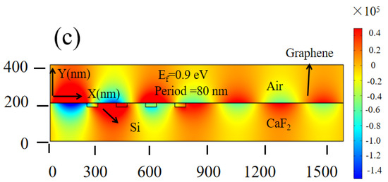 The y component of the electric field at different parameters: (a) period = 40 nm, Ef = 0.3 eV; (b) period = 80 nm, Ef = 0.3 eV; (c) period = 80 nm, Ef = 0.9 eV.