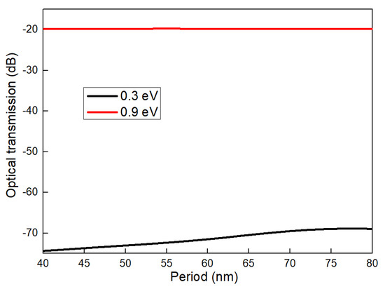 The grating period directly affects the distribution period of carrier density in graphene, resulting in a different scattering effect. The relationship between the optical transmission and different grating periods at 0.3 eV and 0.9 eV is shown in Figure 8, with the optical transmission reaching its maximum value of 54.5 dB when the grating period is 40 nm.