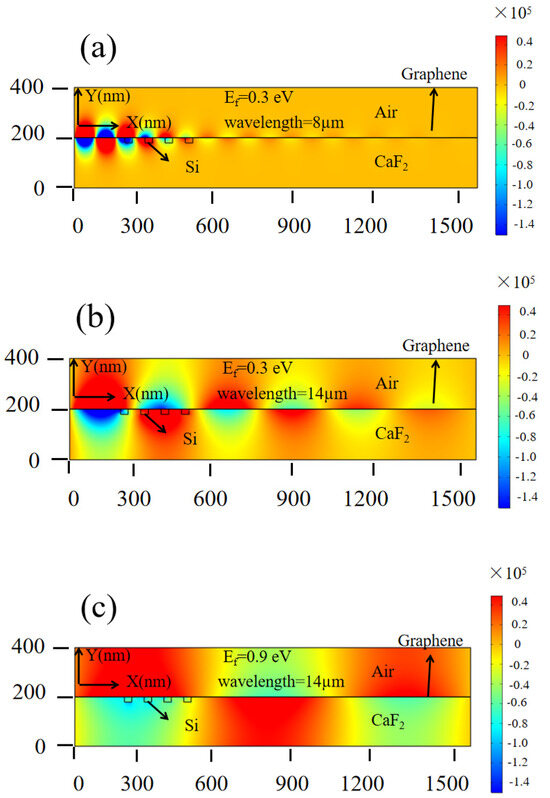 The y component of the electric field at different parameters: (a) wavelength = 8 um, Ef = 0.3 eV; (b) wavelength = 14 um, Ef = 0.3 eV; (c) wavelength = 14 um, Ef = 0.9 eV.