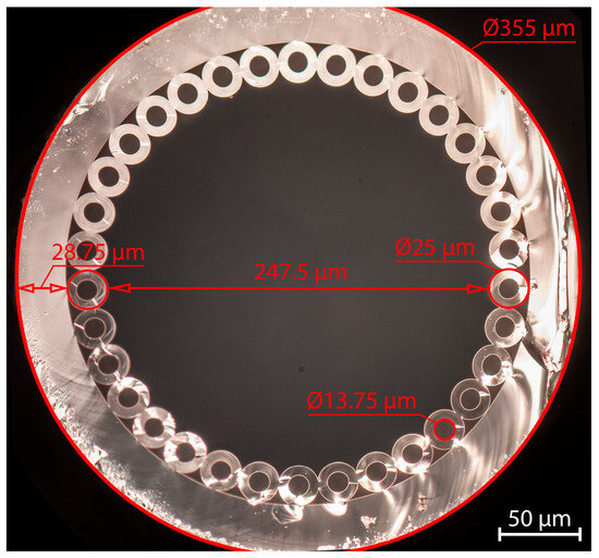 HC-MOWs were manufactured from Ar-Glass (Schott, Mainz, Germany) using stack-and-draw technique by SPE LLC Nanostructured Glass Technology (Saratov, Russia). HC-MOWs have one concentric circle of capillaries that surround a hollow core. Length of all samples was 6 cm; other parameters of the waveguide are shown in Figure 1.