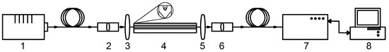The configuration of the experimental setup is delineated in Figure 2. The halogen lamp (Avalight-HAL-S-MINI 2, manufactured by “Avantes”, Apeldoorn, The Netherlands) emits radiation that is converted into a parallel beam by a collimating lens optimized for the range of 200–2500 nm (also manufactured by “Avantes”). This lens is connected to a fiber optical cable, the output end of which is fixed on the adjusting slide. Subsequently, the radiation enters the 10× achromatic objectives lens (JLLSMCMGGX, Nanking, China) (3), the function of which is to focus the radiation to the small core of HC-MOW, which is placed in a special plastic cuvette (4) designed by the authors. The radiation beam is introduced with precision into the hollow core of the waveguide, is collected by the second 10X achromatic objectives lens (5), enters the second collimating lens (6), and is fed into the spectrum analyzer (AvaSpec-ULS4096CL-EVO, Avantes, Apeldoorn, The Netherlands) (7), which is directly connected to a personal computer (8). The noise in the opto-electrical measurement system is approximately 1% of the total intensity, and is corrected by the built-in spectrometer software and smoothing. The spectral resolution of this configuration under consideration is 0.25 nm.