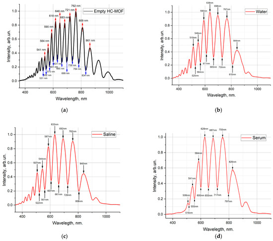 where d is the wall thickness of the shell capillaries, µm; n1 is the refractive index of the medium filling the waveguide structure (in this case, air, i.e., n1 = 1); n2 is the refractive index of glass (1.473). A spectral minimum is located between two maxima. The experimental values of the minima and maxima of the transmission spectrum were then compared with the theoretical calculations (see Table 1). The measurements were carried out for all waveguides used in the experiment. The statistical processing of the measurement data demonstrated that the calculated parameters exhibited the greatest congruence with the experimental values of the resonant-comb wavelengths, which had the smallest standard deviation (SD) values, in the middle section of the spectrum within the wavelength range of 576–701 nm. Figure 3a shows the transmission spectrum of the empty HC-MOW, the HC-MOW filled with water (Figure 3b), the HC-MOW filled with saline solution (Figure 3c), and the HC-MOW filled with diluted serum (Figure 3d).