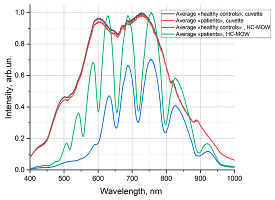 In published studies on the sensing properties of microstructured waveguides, some parameters of the transmission spectrum (e.g., the wavelength of the transmission maximum, its intensity, etc.) are often chosen as the characteristics to be studied [57]. Indeed, in this study, we have shown that, although the transmission spectra obtained with a photometric cell, as well as the refractometric data, do not differ for the patient and healthy control groups, the spectra obtained with HC-MOWs are clearly divided into these two groups according to the signal intensity. Nevertheless, we expect that, in the analysis of complex multicomponent systems, the analysis of the whole transmission spectrum over a wide range of wavelengths, using computer programs and methods that allow for the analysis of multiparametric systems, has great prospects. PCA has been successfully used as such a tool. In future studies, we plan to use supervised machine learning methods (e.g., logistic regression, support vector machines, or neural network classifiers) trained on PCA results for clinical diagnosis.