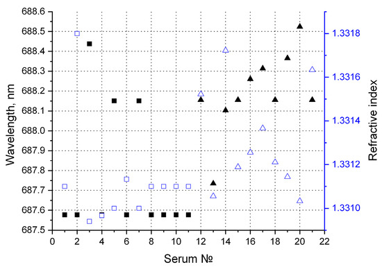 The position of the transmission maximum and corresponding refractive index. ☐—Refractive index for healthy control volunteers. ◼—Transmission maximum for healthy control volunteers. △—Refractive index for patient volunteers. ▲—Transmission maximum for patient volunteers.
