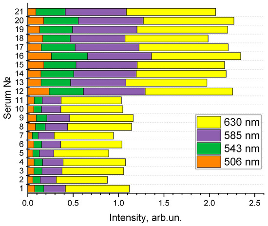 Blood serum contains particles of different geneses, sizes, and shapes. These are glucose, low-density lipoproteins, high-density lipoproteins, triglycerides, albumin (which varies in size because it is a carrier protein and can vary depending on the molecules attached to it), and cholesterol. Scattering particles in blood serum are divided by size into the following ranges: I—1–10 nm, corresponding to low-molecular-weight albumin monomers and free glycolipid complexes; II—11–30 nm, corresponding to globulins and lipoprotein complexes with low molecular weight; III—31–70 nm, corresponding to fibrinogen and its complexes, as well as low-molecular-weight immune complexes; IV—71–150 nm, corresponding to medium-molecular-weight immune complexes; and V—greater than 150 nm, corresponding to high-molecular-weight immune complexes formed as a result of activation of allergic or autoimmune processes [48]. The largest particles are chylomicrons (70–1000 nm), which are potentially responsible for sample turbidity and can be visually detected when the triglyceride concentration exceeds 3.4 mmol/L [54,55]. Turbidity and lipemia can be explained by the presence of lipid particles that scatter light and cause apparent absorption in a wide range of the UV/visible spectrum (from 400 nm to 800+ nm). The color of the serum is due to residual bilirubin (icterus) and hemoglobin. These components provide absorption in the range of 415–579 nm and, due to their proximity, the peaks of hemoglobin and bilirubin partially overlap. Enzymes are present in the blood in insignificant amounts compared to other components, and metal ions are too small to affect the transmission spectra in this system [50,56].