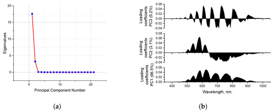 Explained variance of the data matrix from the number of principal components for blood serum samples (a) and loading coefficients of the first three principal components, indicating the contribution of each wavelength to the respective component (b). The percentage of explained variance for each component is shown in parentheses.