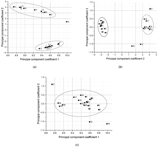From the fourth principal component onwards, the presence of meaningful information seems unlikely. Therefore, significant information in a spectral data matrix of dimensions 21 × 2099 can be described by a maximum of three components, where in the matrix, 21 is the number of samples, 2099 is the number of features (intensities at wavelengths). Figure 8a–c show graphs of scores in a two-dimensional space of three principal components. The ellipse (solid line) marks the boundaries of the 95% confidence interval for each cluster.