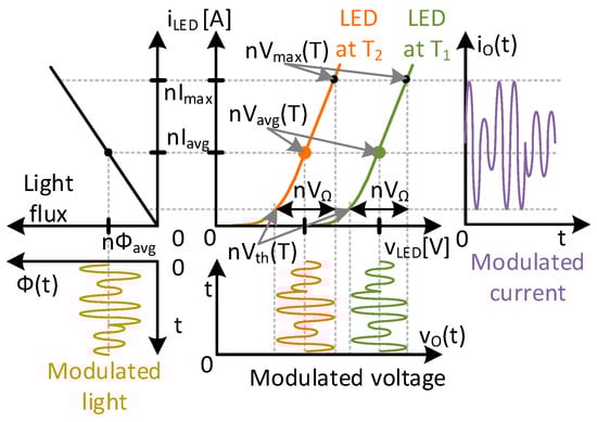 Figure 1 shows the behavior of an HB-LED load and the intrinsic behavior in a VLC system. A VLC system needs to accomplish two tasks: ensure the desired lighting level by controlling the average current through the HB-LEDs, and reproduce the communication signal by applying a high-frequency communication waveform to the HB-LEDs. As Figure 1 shows, for a specific average current nIavg, a light flux nϕavg is emitted and a voltage is obtained. This voltage nVavg(T) depends on the temperature T of the HB-LEDs. If a temperature shift. (T2 > T1) takes place, then the HB-LEDs go from a lower temperature T1 to a higher temperature T2. Here, the necessary nVavg(T) decreases for the same current nIavg. This undesired effect means a control system is needed for the HB-LEDs []. If this effect is not corrected, the quality and performance of the communication could be affected []. Therefore, the driver has to control the average current so that it is always working in the middle of the HB-LED’s linear region. This point (i.e., the middle of the HB-LED’s linear region) always maximizes the range for the communication signal, nVΩ. Therefore, we define the nVΩ as a region between the threshold voltage nVth(T) and the maximum voltage nVmax(T). In other words, it represents the linear part of the voltage–current relationship.