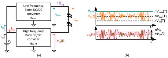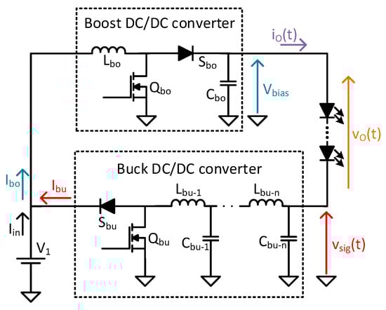 A block diagram of the proposed topology is shown in Figure 2a, and an example of the waveforms is shown in Figure 2b. Both converters are connected to the same input voltage V1, and their outputs are connected in series with respect to the HB-LED string load. The HB-LED string load comprises HB-LEDs. The boost DC/DC converter is responsible for generating a DC voltage Vbias, while the buck DC/DC converter generates the communication signal vsig(t), as shown in the block diagram in Figure 2a.