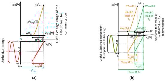 Considering (2) and (3), we can conclude that controlling nVavg(T) when the temperature varies always allows the HB-LED string to work at the middle point of the linear region, which defines the useful voltage range of the HB-LED load for communication, nVΩ. According to Figure 2a, the expression of the voltage across the HB-LED string is