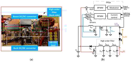 The design and experimental results of a VLC driver prototype based on the parallel/series buck/boost converter proposed above are presented below. Figure 6a shows the prototype, and Figure 6b shows a schematic and block diagram of the control used.