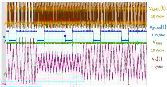 The most representative waveforms of the prototype are shown in Figure 7. The voltages vgs-bo(t) and vgs-bu(t) are the gate signals that control the boost DC/DC and buck DC/DC converters, respectively. There was a significant difference in their operation frequency, with vgs-bo(t) being a 100 kHz signal and vgs-bu(t) being 10 MHz. The voltages Vbias(T) and vsig(t) are the output voltages of the boost DC/DC and buck DC/DC converters, respectively. As can be seen, the voltage Vbias(T) was constant and had negligible ripple. The variations in this voltage were produced by the temperature changes in the HB-LED load. However, the output current feedback loop kept the average current at Io = 0.25 A. Without taking into account any temperature effects and according to the HB-LED manufacturer’s datasheet, at a room temperature of 25 °C, the maximum voltage across the HB-LED for a current of 0.5 A should be Vbias = 32 V. In the operating example shown in Figure 7, after a few minutes of operation, during which the temperature was stable, the maximum voltage dropped to Vbias = 25 V, 21% lower, keeping the overall linear zone of the HB-LED load available to track the signal.