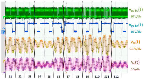 In order to analyze the prototype’s communication capability and correct transformation of the VLC signal into light, a longer transmission was analyzed in more detail, as shown in Figure 8, with 12 different symbols emitted. In this case, vo(t) and the light signal received from the HB-LED load vrx(t) were obtained and compared. The light signal (i.e., vrx(t)) was obtained using a high-bandwidth Thorlabs PDA10A-EC optical receiver []. The receiver was placed in front of the HB-LED load at 0.5 m and provided a voltage output signal proportional to the light variations it received. It can be seen that vo(t) and vrx(t) were proportional, without apparent distortion. Incorrect voltage level design or incorrect polarization control could cause distortion in the emitted light signal, causing the HB-LED load to operate outside the linear range. Neither of these effects is observed in Figure 8.