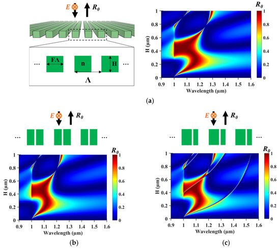 To investigate tunable singular states, we broke the symmetry of a simple one-dimensional (1D) photonic lattice (PL) by incorporating an air slit. Figure 1a illustrates the 1D resonant structure, defined by grating parameters such as period (Λ), fill factor (F), and grating height (H) with the refractive index (n). Continuing the study of singular states, we employed the previous design of the 1D PL [25], where the grating parameter set is { = 1 μm, = 0.5, = 0.5 μm} with a lossless material ( = 2). In this study, we characterized the zeroth-order reflectance () using the rigorous coupled-wave analysis (RCWA) [27] method implemented in commercial software [28]. The analysis is performed using polarized light, with the electric field parallel to the grating grooves (TE polarization), illuminating the 1D photonic lattice (PL) in the air ( = 1). As shown in calculated map of Figure 1a, wideband perfect reflection is observed in the spectral region due to the resonant radiation, which has been understood by the guided-mode resonance (GMR) phenomenon [15]. As the height () increases, additional resonance bands are generated by excitation of higher GMR modes. Figure 1b presents the case where an air-slit with a width of 0.05 μm is introduced at the center of the grating, preserving the structural symmetry. The map shows resonance bands like those observed without the air slit (i.e., Figure 1a) but only a slight narrowing observed. This narrowing can be attributed to the effective refractive index reduction due to the presence of air. In contrast, the resonance band is significantly changed when the symmetry is broken by shifting the air slit. Figure 1c shows the map of the 1D PL with air slit displaced 0.05 μm from the center. The asymmetry of the 1D PL leads to the formation of a sharp band, which can be interpreted as an off-BIC (bound state in continuum) [19] or asymmetric GMR [25]. Observed in the asymmetric system, these resonance bands can be classified as asymmetric guided-mode resonance (aGMR) modes owing to their origin in asymmetric excitation of GMR modes. Notably, shown in the map, the fundamental aGMR mode manifests as a singular state, distinctly separated from the other resonance bands. This singular state will be shown to be tunable through manipulation of the air slit.
