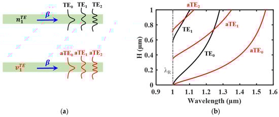 Here, the and represent the symmetric and asymmetric field EMT solutions from each Equations (1) and (2). In case of TM polarization, the EMT solutions are also given by previous works [29,30]. By using the asymmetric solutions of , the EMT model can estimate the quasi-BIC wavelength at which resonant radiation begins when symmetry is gently broken. In this analysis, we focus on the first-order diffraction because the singular states primarily couple with the first-order diffraction modes in this 1D PL. Considering the first diffraction waves, we apply the first solution and for slab waveguide analysis. The eigenvalue problem of the lth TE mode of the slab waveguide can be expressed as [26,31]: