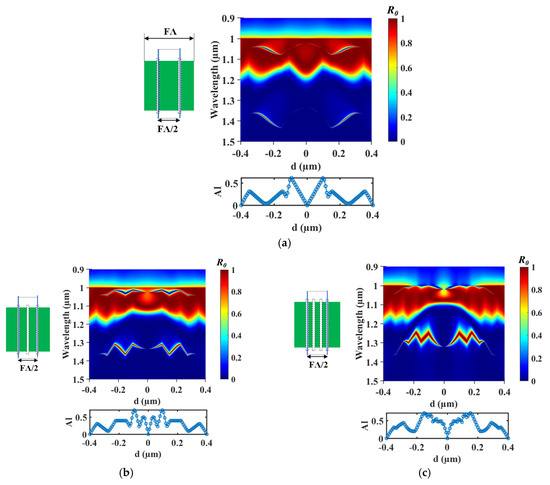 This dual functionality becomes even more dynamic with the introduction of multiple air-slits. As shown in the schematic of Figure 6a, two air-slits are aligned with a pitch width of = 0.25 μm. By varying the displacement from zero to ±0.35 μm, as seen in map, the two sharp aGMRs are rapidly tuned. This behavior corresponds to the one-fold radiation observed in the single-air-slit case of Figure 5. Furthermore, the AI profile for two air-slits closely matches the folded resonant wavelengths, where the AI is calculated using Equation (4) with . Using triple and quadruple air-slits, the aGMRs exhibit even faster tuning due to two- and three-fold radiation effects as presented in Figure 6b,c. Herein, the triple and quadruple air-slits are equally distributed within the same pitch width ( = 0.25 μm). These additional slits introduce more degrees of asymmetry as represented corresponding AI profiles, thus leading to more change in the spectral position of the aGMRs. Meanwhile, these resonances shift toward shorter wavelengths (blue-shift) as the number of air-slits increases because the effective refractive index is reduced by more air gaps. This ability to dynamically tune singular states by simply adjusting the multiple air-slit promise for applications in metamaterials and metasurfaces.