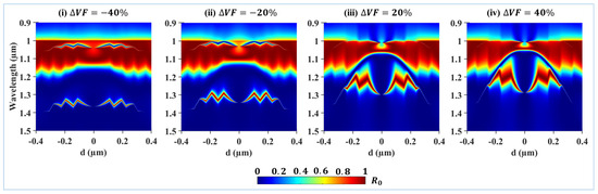 However, fabrication for these air-slit 1D PLs is still challenging, primarily due to the requirement for sub-nanometer pitch deep etching processes. For silicon material, the Bosch DRIE (deep reactive ion etching) process achieves aspect ratios exceeding 120:1 for 35 nm-wide trenches via cryogenic etching [36]. To achieve widths comparable to or larger than 35 nm for the air-slits, the dimensions of the air-slit 1D PLs need to be scaled up by at least seven times. This scaling would allow the structure to operate in the long-wave infrared region (λ = 8–14 μm), where dynamic tunable filtering can be expected. Notably, these air-slit PLs provide tolerant tunability to variations in the void factor () of air-slits. The effects of deviations on the quadruple air-slit PL are illustrated in Figure 7, which presents maps for deviations of (i) −40%, (ii) −20%, (iii) 20% and (iv) 40%, with all other parameters consistent with those in Figure 6c. Notably, even when is reduced to −40%, both filtering channels maintain their functionality, but the operational tuning range decreases by 35%. This reduction is less degraded at = −20%, where the tuning range decreases by only 8%. Positive deviations exhibit distinct effects, allowing only the bandpass filtering channel. At = 20%, this channel benefits from an increased tuning range. However, at = 40%, the bandpass channel undergoes significant spectral broadening.