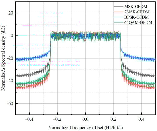 where fc is the modulation frequency. The normalized power spectral density of the OFDM signal in MSK, BPSK, and 64QAM mapping modes is shown in Figure 3.