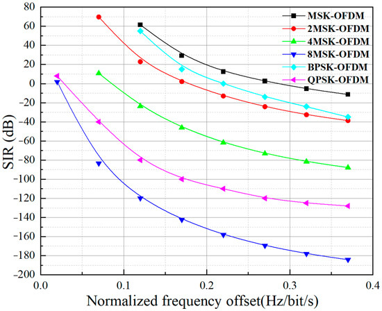 Figure 8 shows the signal to interference ratio (SIR) of different modulations. The SIR represents the ratio of signal power to interference power, indicating the signal’s anti-interference ability. As the modulation order N increases, the SIR decreases, which is due to the higher modulation order leading to more superimposed MSK signal paths and greater interference between signals. Among these modulations, MSK-OFDM has the highest SIR, followed by 2MSK-OFDM, BPSK-OFDM, 4MSK-OFDM, QPSK-OFDM, and 8MSK-OFDM in descending order of the SIR.