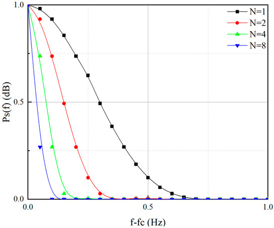 According to Equation (14), the power spectral density curve for MSK (N = 1, 2, 4, 8) is shown in Figure 9. When N = 1 and B = 0.75Rb, the spectral efficiency is about 1.33 bit/s/Hz. When N is taken as 2, 4, and 8, respectively, according to Figure 9, B is 0.38 Rb, 0.19 Rb, and 0.09 Rb, respectively, and the spectral efficiency value is about 2.63 bit/s/Hz, 5.26 bit/s/Hz, and 11.11 bit/s/Hz. Therefore, when the modulation order N value increases, the spectral efficiency also increases because multilevel modulation can improve the transmission efficiency of the channel by transmitting more information in each symbol, so the spectral efficiency is higher.