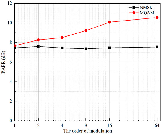 The PAPR value of NMSK-mapped and MQAM-mapped OFDM system.